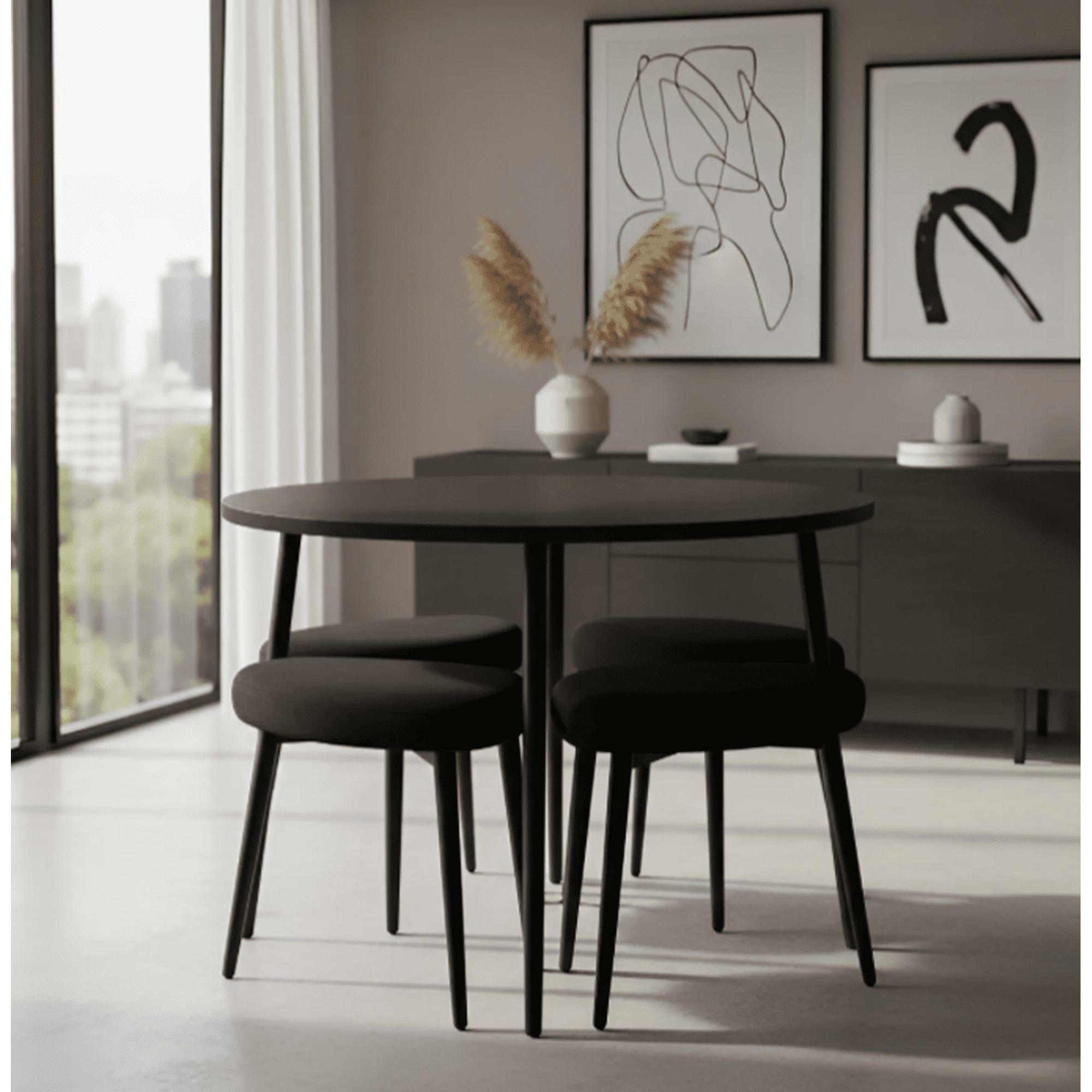 Mesa de comedor redonda de madera con bancos tapizados y acolchados de estilo moderno de estructura resistente ideal para optimizar espacios - mesa 90 cm y 4 bancos + kit de armado